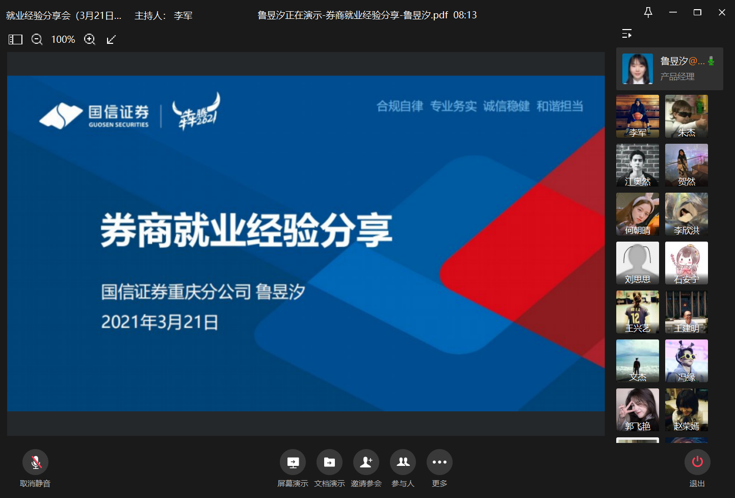 3月21日上午10:00,天游ty8线路1线路2检测中心就业经验分享会于企业微信成功举办。本次活动邀请到国信证券股份有限公司的12级CFA专业鲁昱汐、广发银行股份有限公司的16级金融五朱杰、德勤华庆商务服务有限公司的16级投资二冷小兰、中汇国际保险经纪公司的16级保险一文思力进行就业经验分享。天游ty8线路1线路2检测中心党委书记、副院长王建明,天游ty8线路1线路2检测中心党委副书记、纪委书记余新,以及天游ty8线路1线路2检测中心一百多名同学参加了会议。