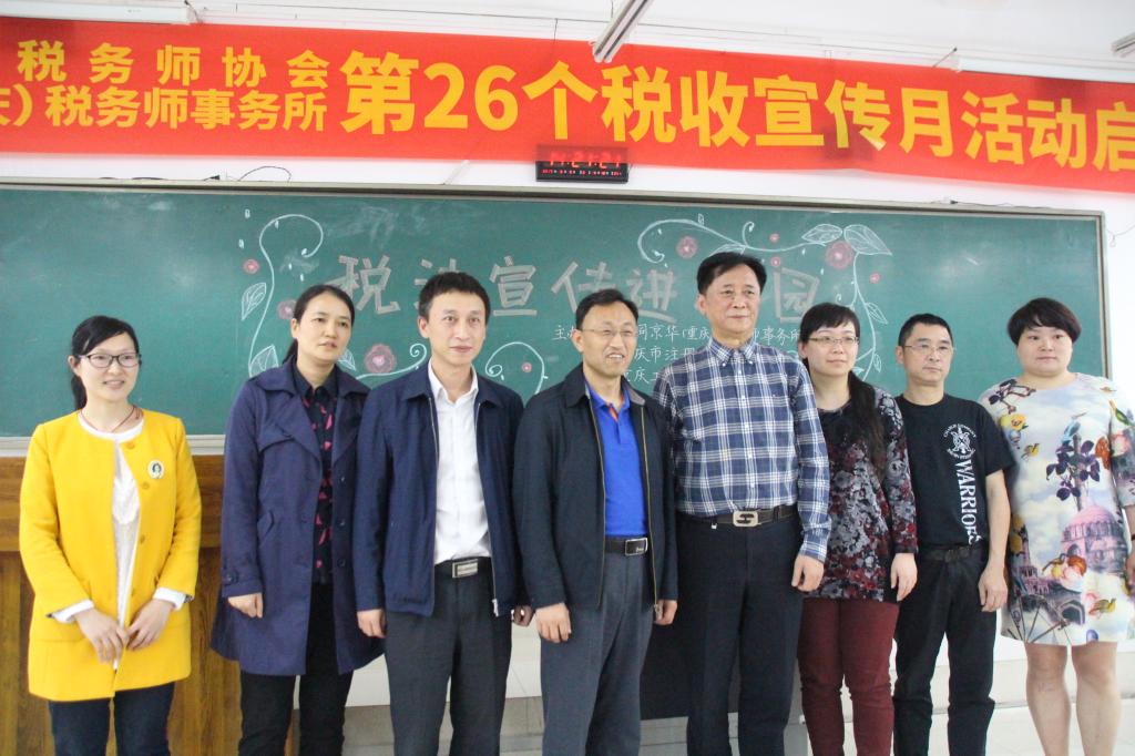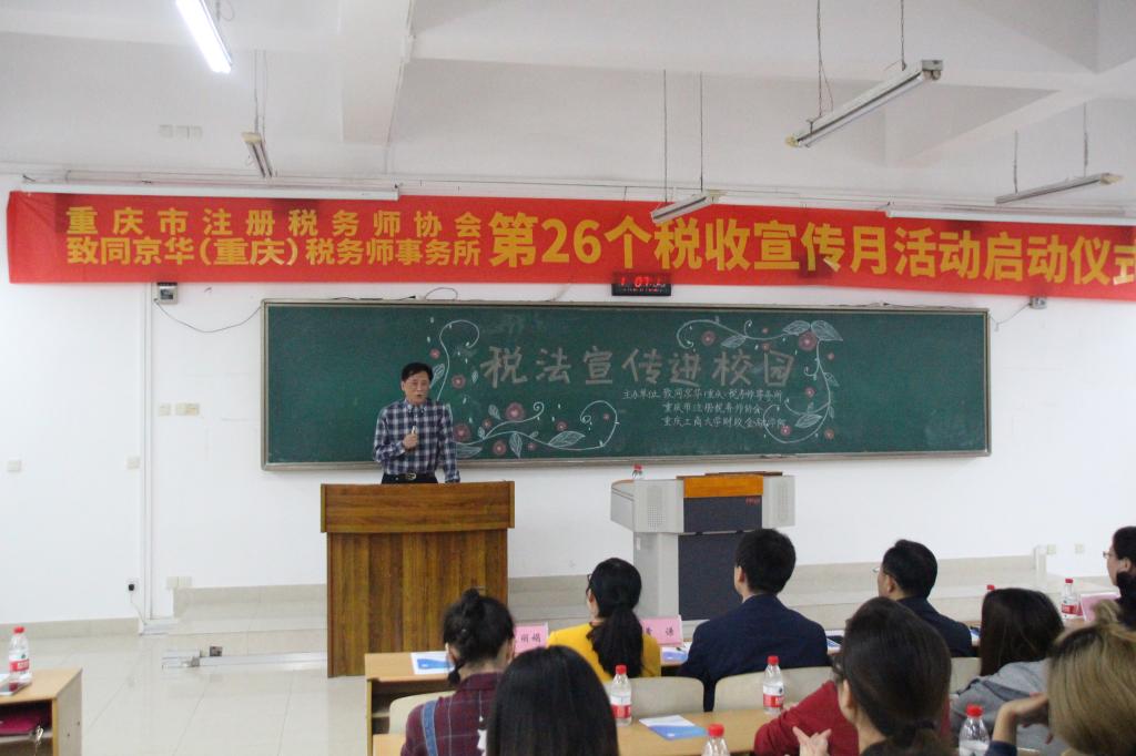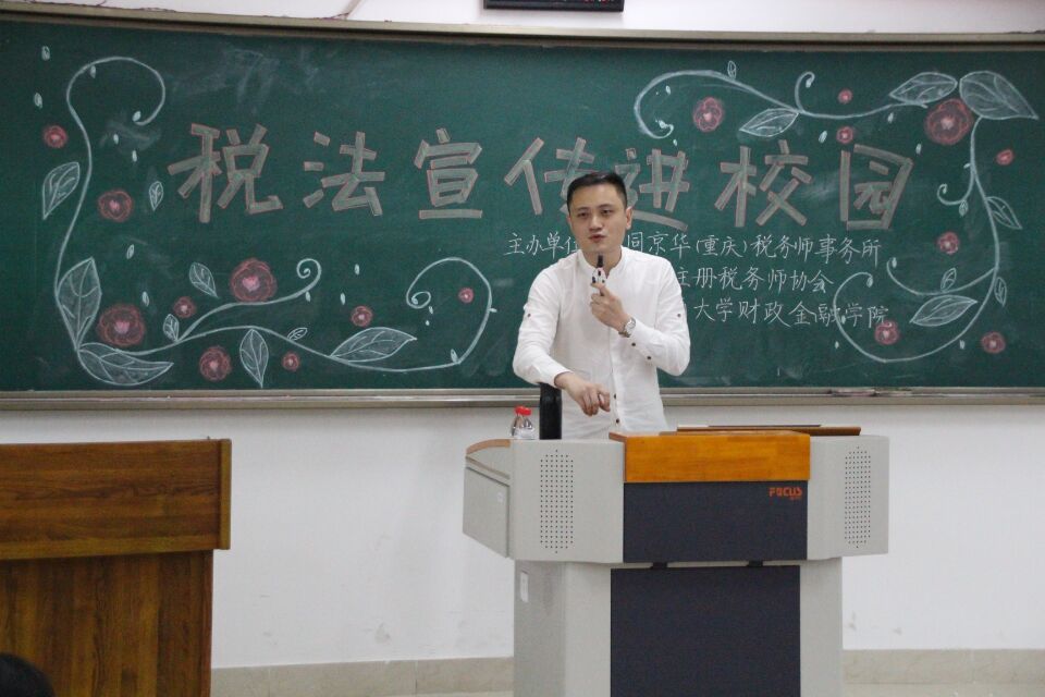 5月5日下午,由致同京华(重庆)税务师事务所、重庆市注册税务师协会、财政天游ty8线路1线路2检测中心联办的2017税法宣传进校园活动在南岸校区博智楼212教室成功举办。重庆市注册税务师协会副会长陈光信、重庆市注册税务师管理中心副主任王洪宇、天游8线路检测中心财政天游ty8线路1线路2检测中心党委副书记黄谦、致同京华(重庆)税务师事务所首席合伙人白云燕、注册税务师管理中心副处调研员徐勇、财政天游ty8线路1线路2检测中心财税系主任尚可文、致同京华(重庆)税务师事务所副总经理陈怡、财政天游ty8线路1线路2检测中心学团办主任兰丽娟出席了本次活动。