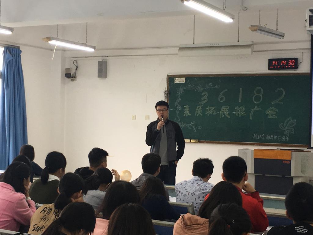 为全面提高大学生的综合素质,培养学生勤奋学习、勇于创新的精神,开辟一条锻炼自我、走向成功的道路,学校特别制定并逐步完善了《天游8线路检测中心素质拓展第二课堂活动学分管理办法》,将“36182”素质拓展工程贯彻落实到16级新生中去。2016年10月15日下午,“36182”素质拓展推广会在博智楼403如期举行。财政天游ty8线路1线路2检测中心分团委学生会副主席庞世强、校学生会素拓部部长何凯萌、财金学院分团委学生会素拓部部长陈曦曦、余柔芳出席活动。