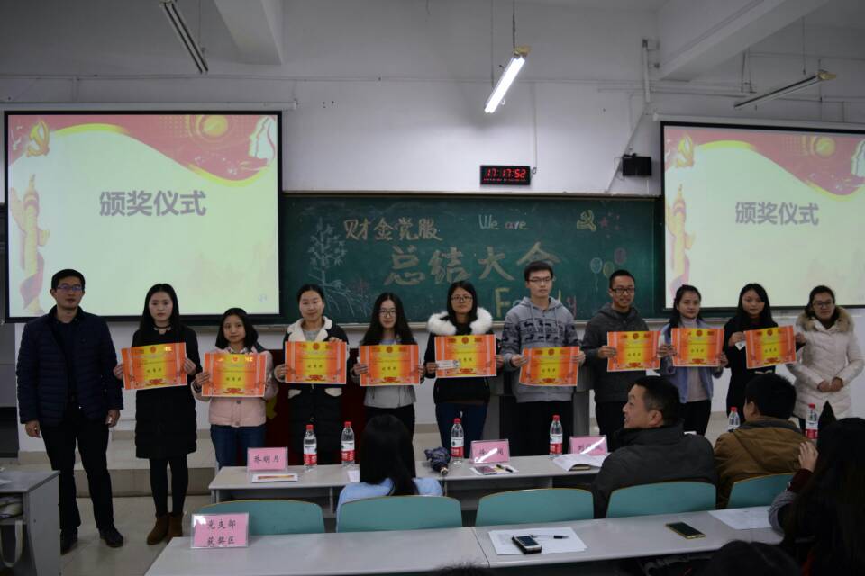 时光飞逝,又一个学期即将就此画上圆满的句号。为总结财金党服本学期的工作状况,也为了提升财金党服干部的工作积极性,表彰党服优秀团队和个人,2016年12月15日下午17点,财金党服在博智楼107举行了“财政天游ty8线路1线路2检测中心党员服务站总结表彰大会”。出席本次大会的有财金党总支副书记刘代成、财金分团委书记徐阔、财金第一党支部书记文理、财金第三党支部书记范乐乐、财金学科竞赛指导老师余红霞、党服指导老师乔明月、财政天游ty8线路1线路2检测中心党员服务站全体同学及其相关获奖代表。在财金党服干部彭枭、马丽君的主持下,本次财金党服总结表彰大会正式拉开帷幕。