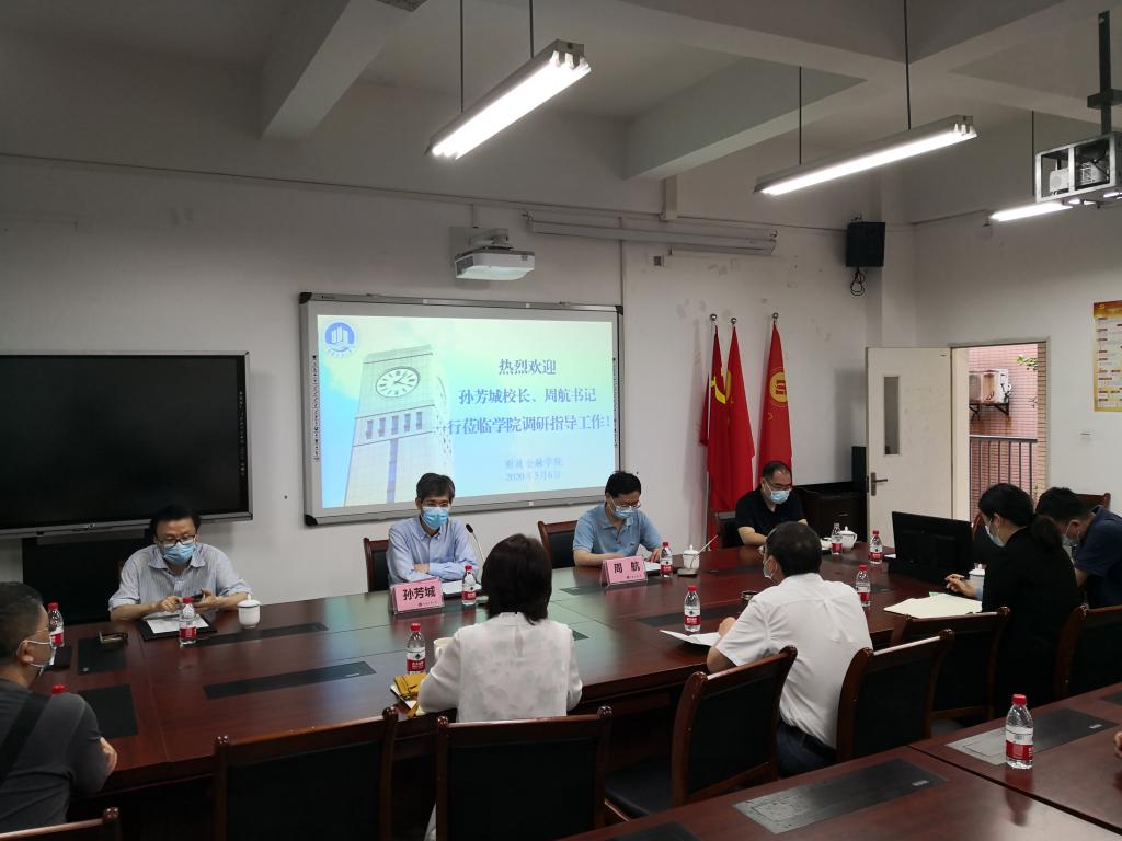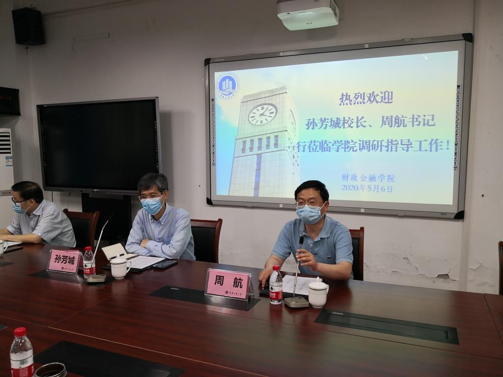 5月6日上午,校长孙芳城、校纪委书记周航一行到财政天游ty8线路1线路2检测中心调研指导学科建设和疫情防控工作,并在田家炳313会议室召开调研座谈会。教务处处长靳俊喜,研究生院院长田双全,以及学院领导、各系主任、财税系全体教师和部分辅导员参加了会议。