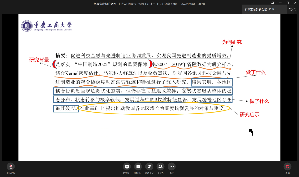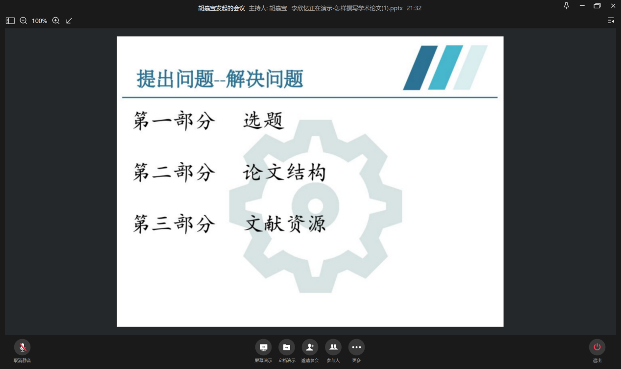 11月28日晚19:00,为提升学生论文撰写水平,营造良好的学术氛围,天游ty8线路1线路2检测中心研分会在企业微信线上举行“如何撰写高质量论文”分享会。
