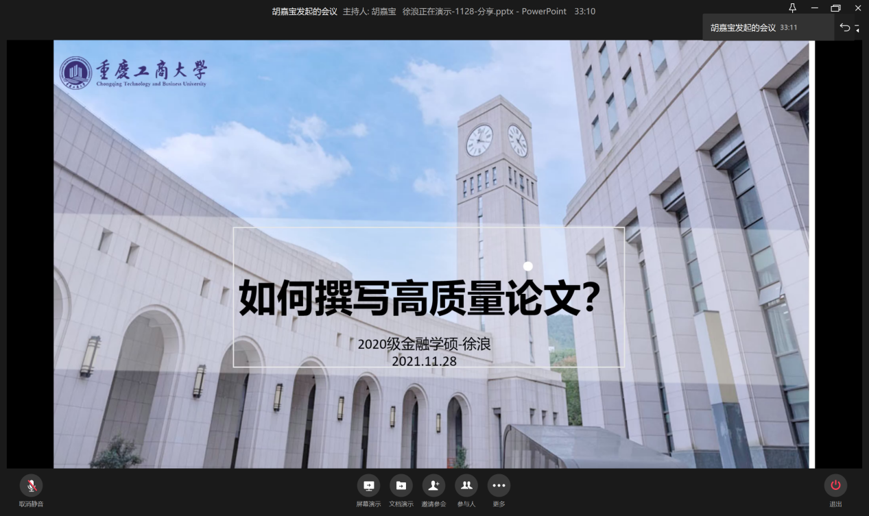 本次交流会邀请了有论文发表经历的刘柳巧、李欣忆、徐浪三位同学分别分享了撰写和发表论文的经验,并针对如何提高撰写高质量论文进行了详细讲解。一是要确定研究主题,围绕研究主题大量阅读权威学者、期刊的论文,进行分类梳理,挖掘好的选题;二是掌握科学的数据处理技术,重点掌握一些常用的软件,推荐到经管之家网站进行学习交流;第三,重视论文的反复修改,与导师进行交流,参加学术会议听取专家意见,持续地提高论文质量;第四,注意学术规范,参考文献写作格式要标准。在互动环节,大家对数据处理软件、数据来源、论文发表途径等进行了交流。