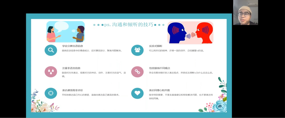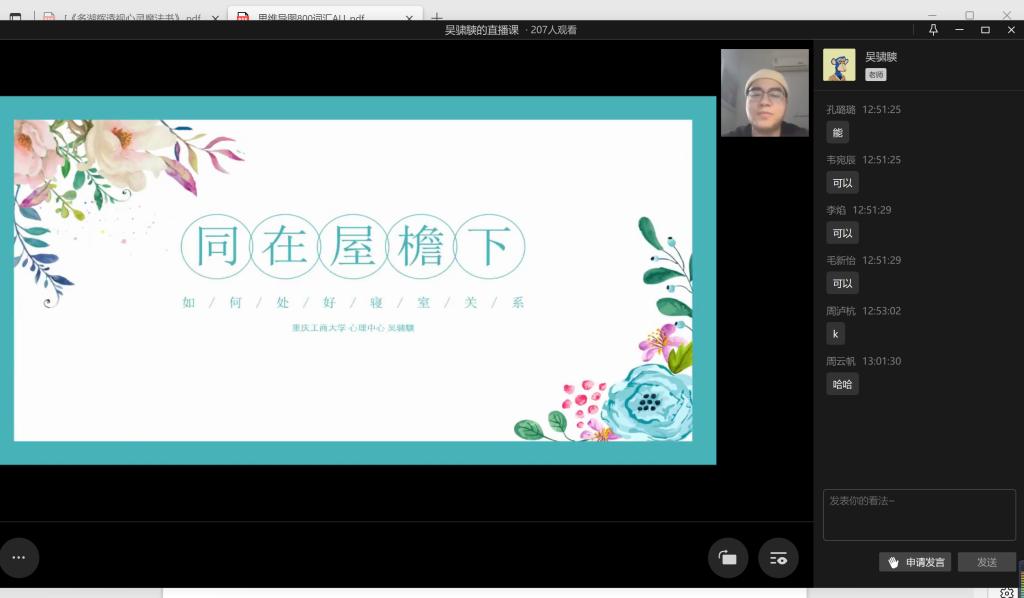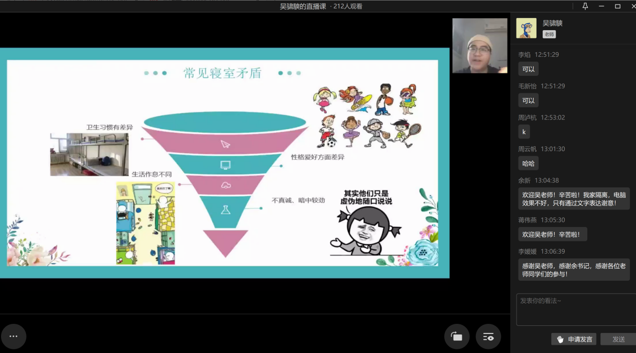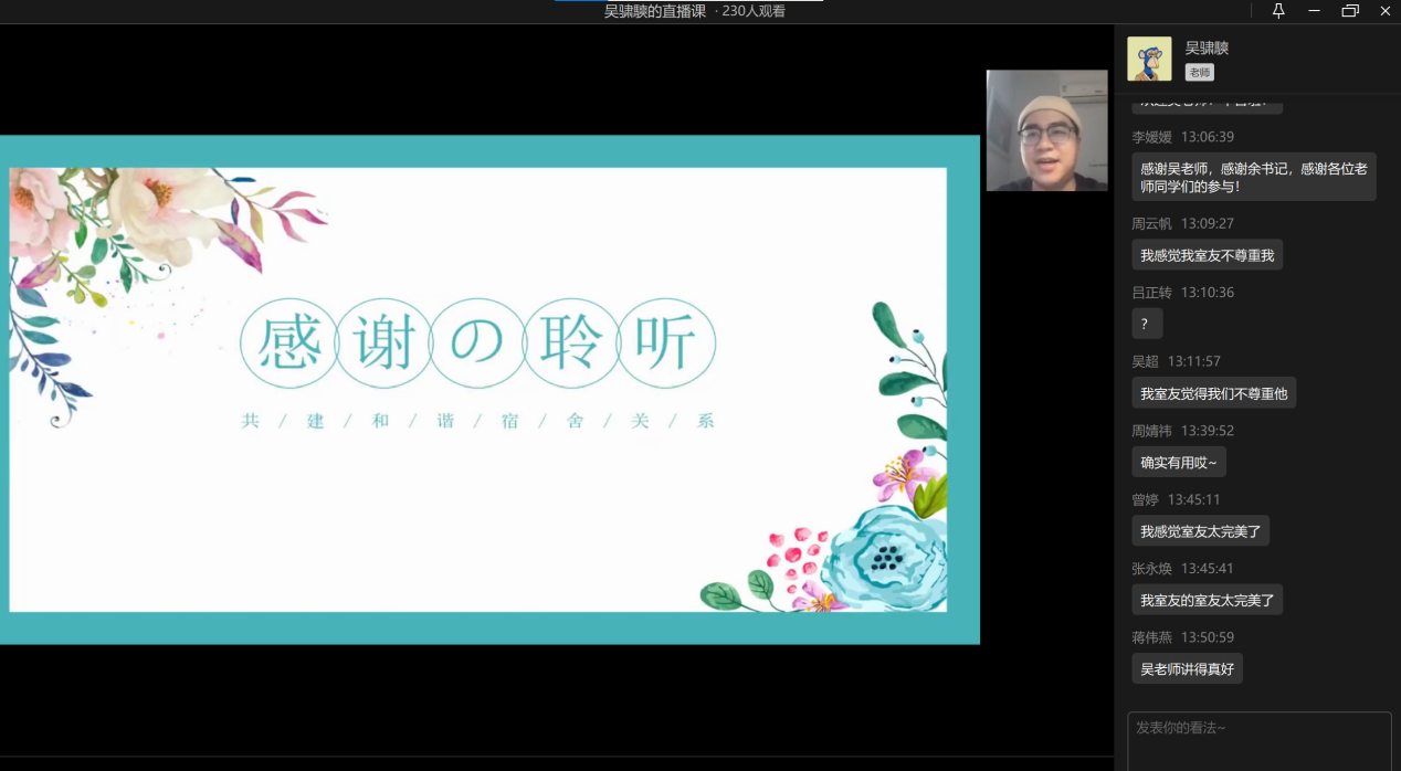 2022年11月11日中午13点,天游ty8线路1线路2检测中心心理工作站主办的“同在屋檐下——和谐寝室关系”心理讲座于企业微信线上平台顺利举办。此次讲座邀请到了学校心理健康教育与咨询中心吴骕騻老师作为主讲人,讲座内容丰富、寓教于乐,受到了同学们的热烈欢迎。