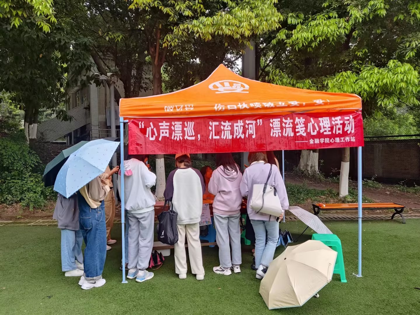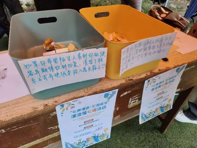 纷纷的小雨也没有掩住同学们积极参与的热情。同学们分别在便签上写下自己的焦虑和开心的事情,并将其投入代表不同心事的不同颜色的箱子中,并从与自己心声不同的箱子中取出一张便签,观看后写下自己的寄语;给予焦虑的同伴以安慰和就不同角度的解决方案,分享同伴最真挚的喜悦使其双倍。