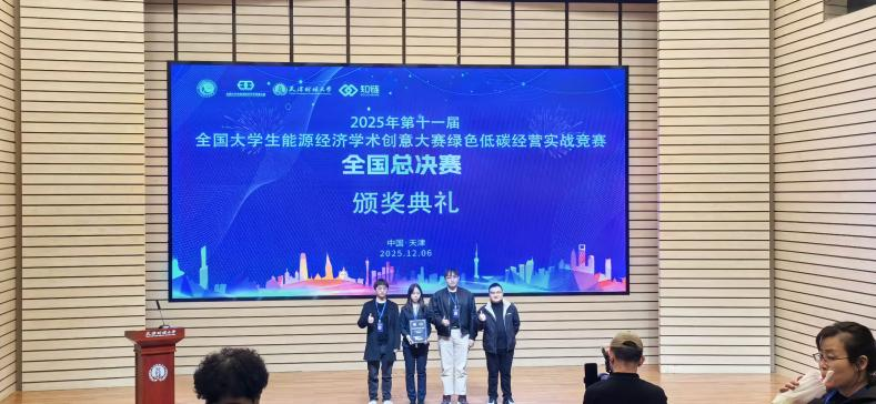 12月6日,2025年第十一届全国大学生能源经济学术创意大赛在天津财经大学圆满落幕。天游8线路检测中心天游ty8线路1线路2检测中心教师董翔宇博士指导,由杨明爚、韩静汝、丁文皓等学生团队在全国大学生能源经济学术创意大赛绿色低碳经营实战竞赛全国总决赛中,从全国100所参赛高校中脱颖而出,斩获赛事最高奖项特等奖,彰显了我校在碳金融交叉学科人才培养中的突出成效。