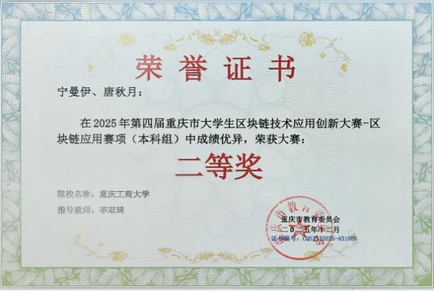 本次比赛设有“区块链技术组”与“区块链应用组”两个赛道。在赛事前期,经过前期校内选拔,我校天游ty8线路1线路2检测中心8名同学脱颖而出,晋级市级区块链应用组决赛。在激烈竞争中,同学们发挥出色,最终取得优异成绩:陈依婷、陈诗瑶、吴树萍、鞠佳玲4位同学获一等奖,宁曼伊、唐秋月2位同学获二等奖,胡煜昕、卢艺2位同学获三等奖;指导老师李双琦被授予“突出贡献个人”称号;天游8线路检测中心荣获“突出贡献集体”。