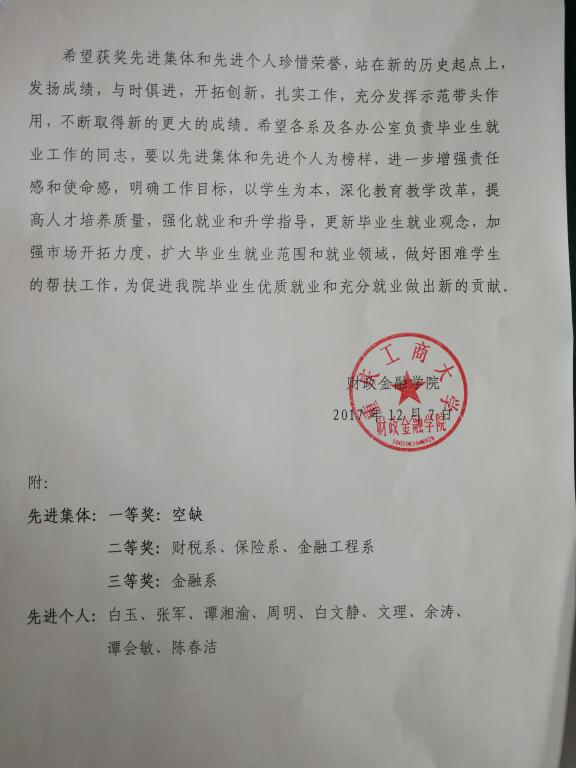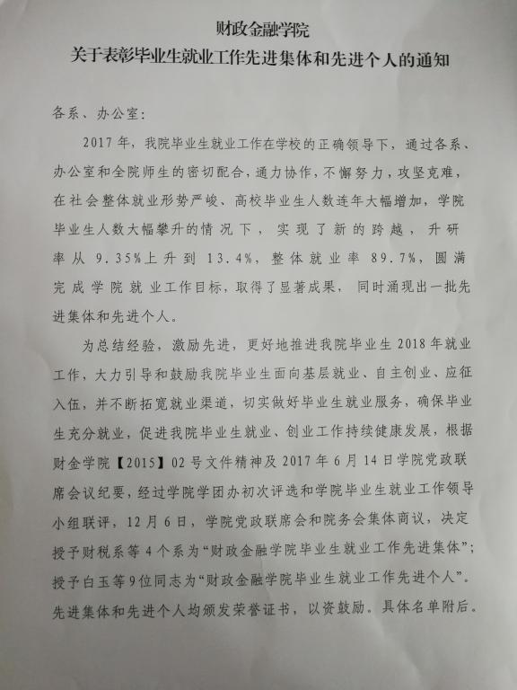 为总结经验,激励先进,更好地推进天游ty8线路官网毕业生2018年就业工作,大力引导和鼓励天游ty8线路官网毕业生面向基层就业、自主创业、应征入伍,并不断拓宽就业渠道,切实做好毕业生就业服务,确保毕业生充分就业,促进天游ty8线路官网毕业生就业、创业工作持续健康发展,根据财金学院【2015】02号文件精神及2017年6月14日学院党政联席会议纪要,经过学院学团办初次评选和学院毕业生就业工作领导小组联评,12月6日,学院党政联席会和院务会集体商议,决定授予财税系等4个系为“财政天游ty8线路1线路2检测中心毕业生就业工作先进集体”;授予白玉等9位同志为“财政天游ty8线路1线路2检测中心毕业生就业工作先进个人”。先进集体和先进个人均颁发荣誉证书,以资鼓励。具体名单附后。