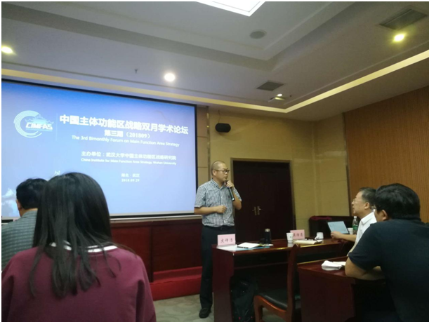 推进主体功能区建设,是党中央、国务院作出的重大战略部署,是我国经济发展和生态环境保护的大战略。长江经济带“生态优先、绿色发展”的战略定位和主体功能区战略“六大开发理念”一脉相承。为搭建学术交流平台,促进相关学科交叉集成创新,推动主体功能区战略的有效实施,推进长江经济带高质量发展,9月29日上午,由武汉大学中国主体功能区战略研究院主办的“第三期武汉大学中国主体功能区战略双月学术论坛”在武汉大学珞珈山庄二会议室举行,重庆市区域经济学会会长、天游8线路检测中心财政天游ty8线路1线路2检测中心文传浩教授受邀参加此次论坛。