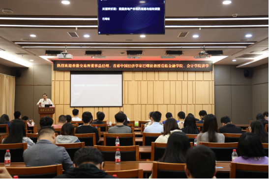 随后,巴曙松教授以“关键转折期:我国房地产市场的周期与结构调整”为主题开展了专题讲座。他从交易额、房价、复苏、城市和开发商五个方面具体分析了我国房地产关键时期的特征、房地产市场的修复,以及当前所呈现的新特点。他指出,房地产在观察经济、金融市场、股票市场等领域是一个非常重要的指标和切入点,房地产市场的变化往往能同时连接宏观和微观,以及市场政策。他详细介绍了我国在房地产市场关键转折期中新房市场、供求关系、需求特征、住房金融以及政策等五大方面的特征,并以日本、韩国等国家为例,直观地呈现了我国房地产目前面临的困境和市场修复办法。在互动环节,巴曙松教授对参会师生代表提出的问题逐一做了详细解答。