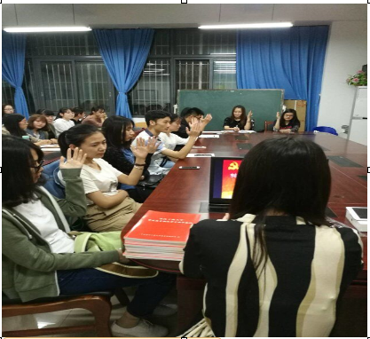 之后我们进行了入党积极分子发展规程,由付欢欢等入党积极分子逐一讲述自己的入党动机。申请入党的同学都真情的表达了对党的向往,对党的忠诚,表示坚定不移跟党走,为党的工作付出自己的力量,为共产主义事业奋斗终生。依次表明了入党动机和他们要加入中国共产党的强烈愿望。每位积极分子发言之后,各对应入党介绍人对其进行学习、工作、实践活动等方面进行评价。最后拥有表决权的党员对接收预备党员进行了举手表决,最终全体党员一致同意发展对象正式成为预备党员。