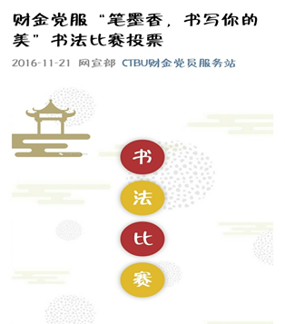 为了表达我们对党的热爱,学习习近平总书记的讲话,激发大生这一先进群体的爱国爱党热情,加强大学生群体的党性素养。也为了在我们学生群体引导提倡书写,用笔尖书写中华汉字之美,渲染一种文化氛围,充分调动学生群体参与活动的积极性,天游8线路检测中心财金学院党员服务站于2016年11月15日至12月9日举办了以“笔墨香,书写你的美”为主题的线上书法比赛活动。