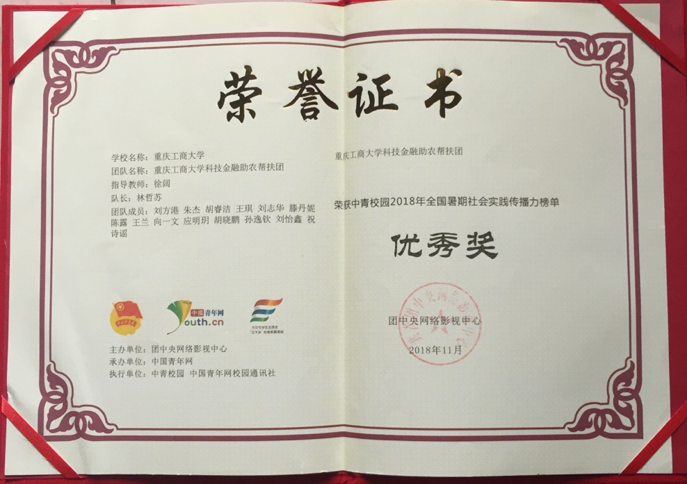2018年12月19日,由团中央青年发展部、团中央网络影视中心主办,中国青年网、对外经济贸易大学团委承办的2018年“镜头中的三下乡”总结会暨中国青年网校园通讯社通讯站授牌仪式在对外经济贸易大学举行。天游ty8线路官网三下乡团队队长林哲苏赶赴北京参与本次会议。本次会议有300余所高校参加,其中包括清华大学、中央财经大学、华中师范大学、武汉科技大学等其他高校。在本次由团中央举办的2018年“镜头中的三下乡”活动评选中,天游ty8线路官网荣获全国百强传播力团队表彰。