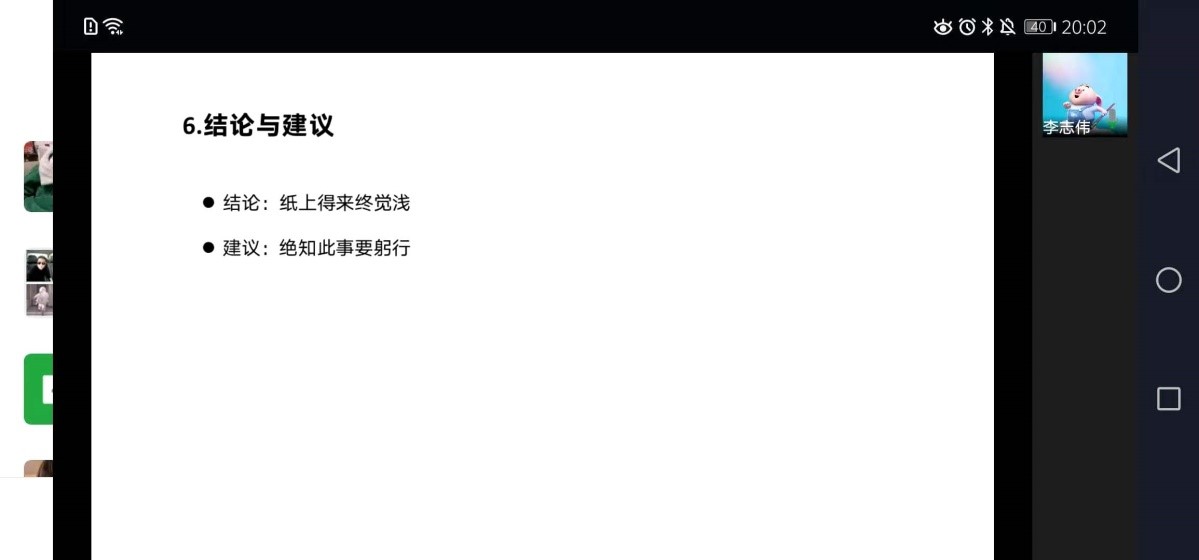 第五位分享者,李志伟学长以自己的案例分享如何做好综测的每一部分,提出对于智育我们可以做好,对于科研我们能否做好,对于社会工作我们能做到更好等,讲述了关于考博的一些事情,对于我们这种非一流学校,要想提高自己的优势就必须要有拿得出手的期刊论文等以及关于考博的一些其他相关事项,在最后还提出了自己的一些建议,学长说出了纸上谈兵终觉浅的结论,提出绝知此事要躬行的建议。