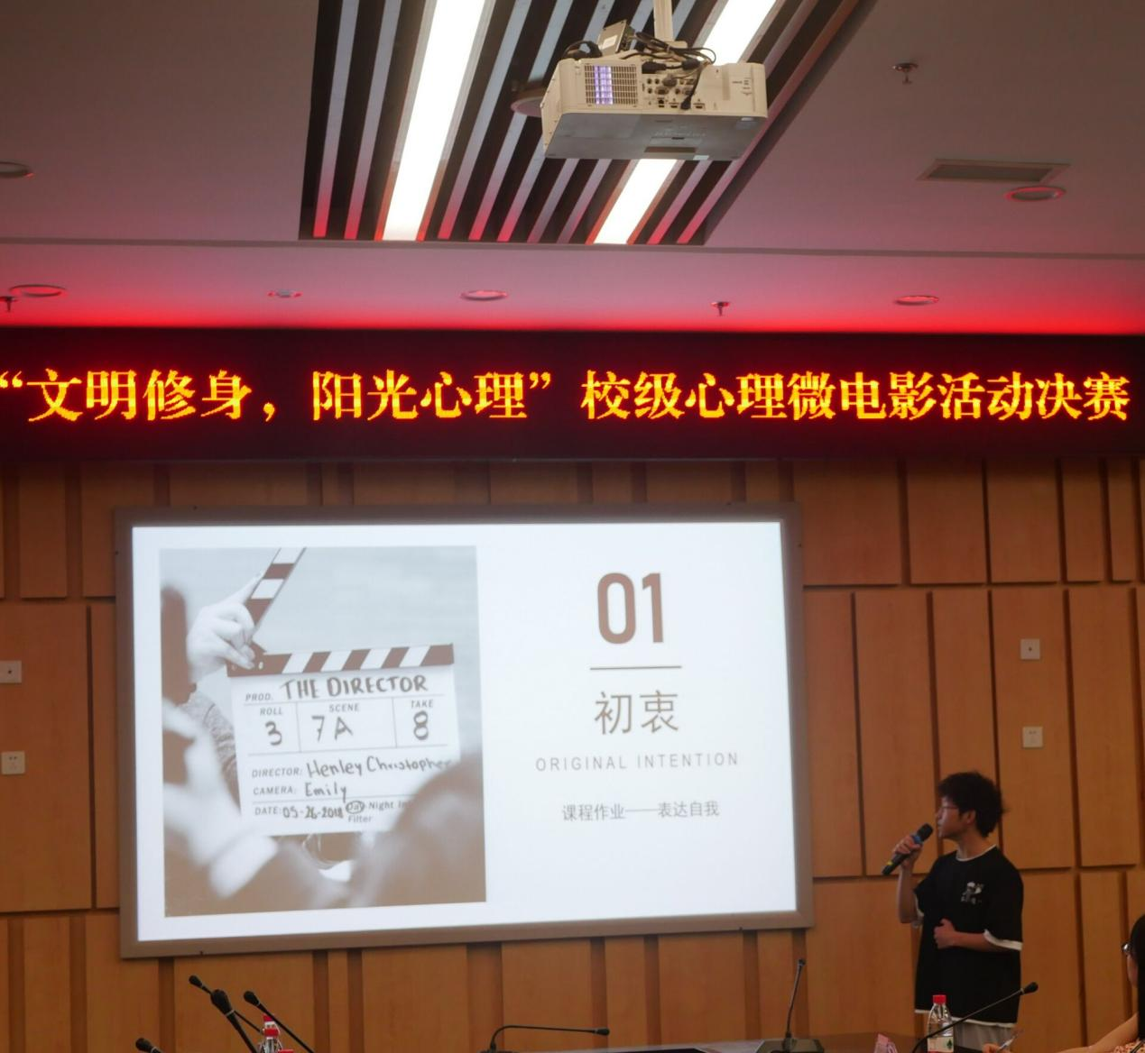 随后比赛正式拉开帷幕。在经历了前期报名宣传、初赛筛选后,最终来到决赛的十个团队为我们带来了不同的故事。十个作品围绕着大学生常见心理问题,内涵丰富,富有深意。选手们在作品播放完毕后,使用ppt讲解形式向在场评委老师、嘉宾和观众传达了他们的拍摄理念和主题思想,并以此为载体向大家讲解心理病症,科普心理学知识。