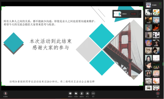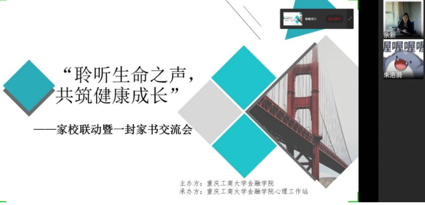 天游ty8线路1线路2检测中心 “聆听生命之声,共筑健康成长”暨一封家书家校联动交流会于2021年10月10日下午14:00通过企业微信线上平台顺利举办。此次活动以引导学生撰写一封家书的形式,搭建起大学生与父母之间的沟通桥梁,交流聆听彼此的心声,帮助大学生心理健康成长。
