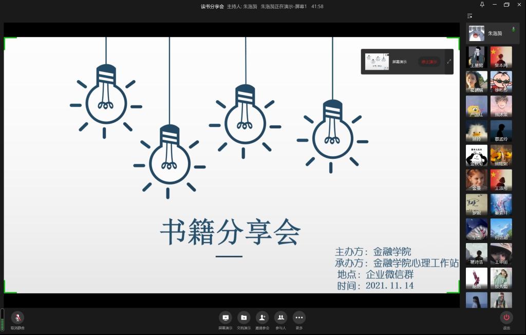 为了促进大学校园的文化氛围,提高同学们的学习积极性,加强良好的心理健康教育, 2021年11月14日下午两点,天游ty8线路1线路2检测中心心理工作站举办的 “书籍分享会”线上活动在企业微信群如期进行。天游ty8线路1线路2检测中心心理工作站工作人员、心理委员和多名学生参加了此次分享会。