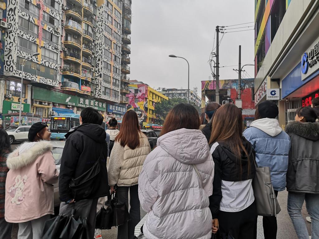 事前,同学们通过媒体报道、政策文件宣传等方式了解了“五座城”的建设定位:中部历史母城、东部生态之城、西部科学之城、南部人文之城、北部智慧之城,对城市功能区的提档升级充满期待。本次参观的九龙半岛艺术湾区,是长江文化艺术湾区的重要部分,同学们赴九龙半岛规划馆参观调研九龙半岛的具体布局和详细功能分区;围绕四川美术学院和黄桷坪涂鸦一条街及其周边区域感受文创和文旅开发成果。同学们一路前行一路赞叹,感受着扑面而来的艺术的气息。黄桷坪的川美老校区门外,一个由红色墙砖和不规则曲面的“蜂巢”形建筑,透过玻璃依稀可见陈列的画作。这个在建的艺术长廊是黄桷坪涂鸦街提升改造项目的一部分,计划沿街改造全长约1200米。漫步街道,同学们身处在艺术的海洋中,楼栋的彩绘已焕然一新,不少同学感叹,在色彩的构造下,居民楼好似都拥有了独特的个性。