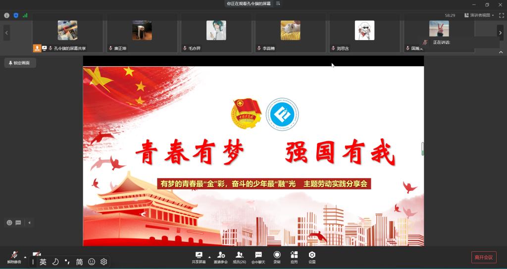 为鼓励同学们积极参与劳动实践活动,树立正确的价值观、劳动观、成才观, 4月10日20:30,天游ty8线路1线路2检测中心于企业微信开展了“有梦的青春最‘金’彩,奋斗的少年最‘融’光”主题劳动实践分享会。本次分享会由天游ty8线路1线路2检测中心分团委社会实践部部门负责人孔令旗主持,会议邀请到四位同学为大家分享劳动实习经验和志愿服务经历。