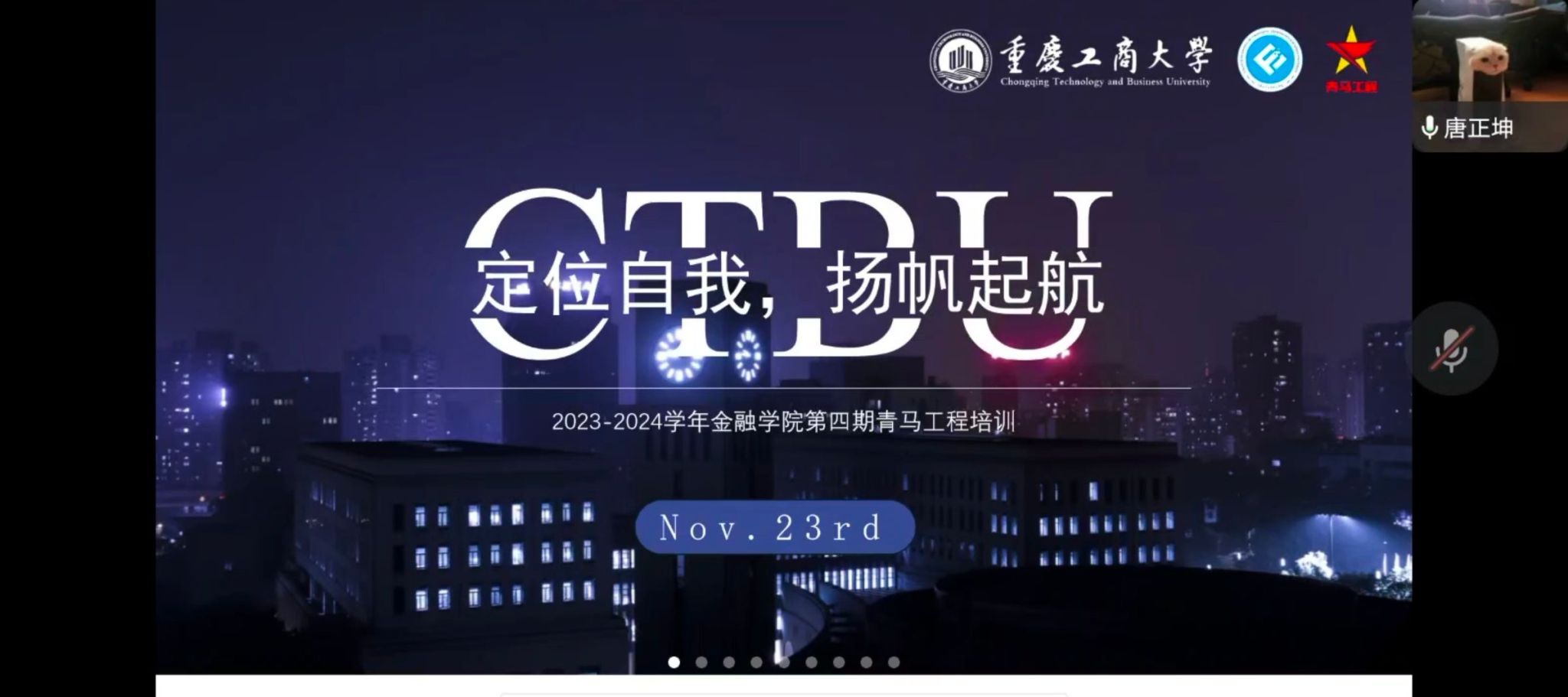 为帮助金融学子加强自我认知,做好学业职业规划,2023年11月23日晚上21:30,天游ty8线路1线路2检测中心在线上举行了“定位自我,扬帆起航”为主题的第四期青马工程培训。会议邀请了原天游ty8线路1线路2检测中心分团委(学生)副书记、19CFA1唐正坤校友作为主讲人。