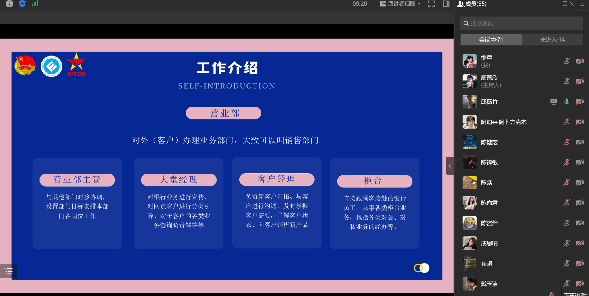首先进行的是邱薇竹同学的寒假实习经验分享,她本次实习的地点是重庆银行两江分行。邱薇竹将本次分享分为了四个部分。她以工作介绍这一部分进行切入,向大家展示了她的工作环境和交通状况。紧接着她通过播放视频的方式着重为大家展示了她的工作内容,精美生动的视频让大家仿佛身处其中,提前感受到了工作的紧张和有趣。在进行感悟分享时,她表示春节前后银行加班其实是常态,进行银行工作一定要放平心态,越是忙碌就越要细心和耐心。同时她提到,在银行工作软实力有时候比硬实力更加重要,良好的工作环境、人际关系往往是做好工作的第一步,学会如何与人交往是进入社会的必修课。最后,她表示本次实习带给了她很多新的收获,她建议大家在时间充足、精力允许的条件下走出课堂参与社会实践,以此来探索和培养自己的能力。同时对于实习她建议大家要放平心态,不随波逐流,坚定自己的人生选择。