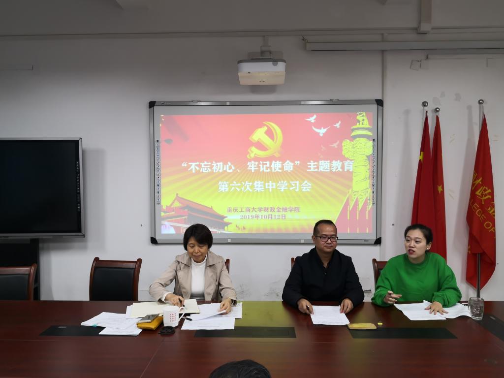 按照学校“不忘初心、牢记使命”主题教育领导小组近期工作安排,结合学院党委“不忘初心、牢记使命”主题教育工作计划,10月12日,财政天游ty8线路1线路2检测中心召开了“不忘初心、牢记使命”主题教育第六次集中学习会,学院领导班子全体成员和各支部书记参加了学习。会议由院党委书记杨萍主持。