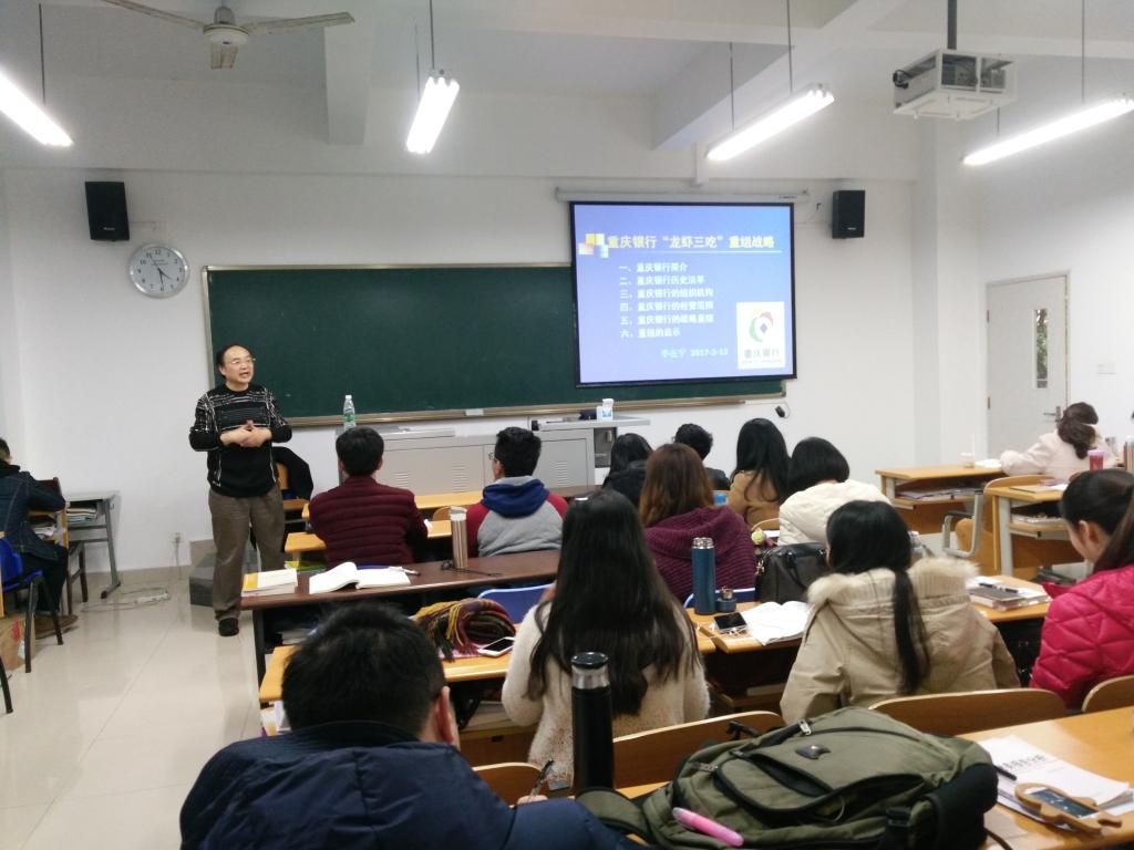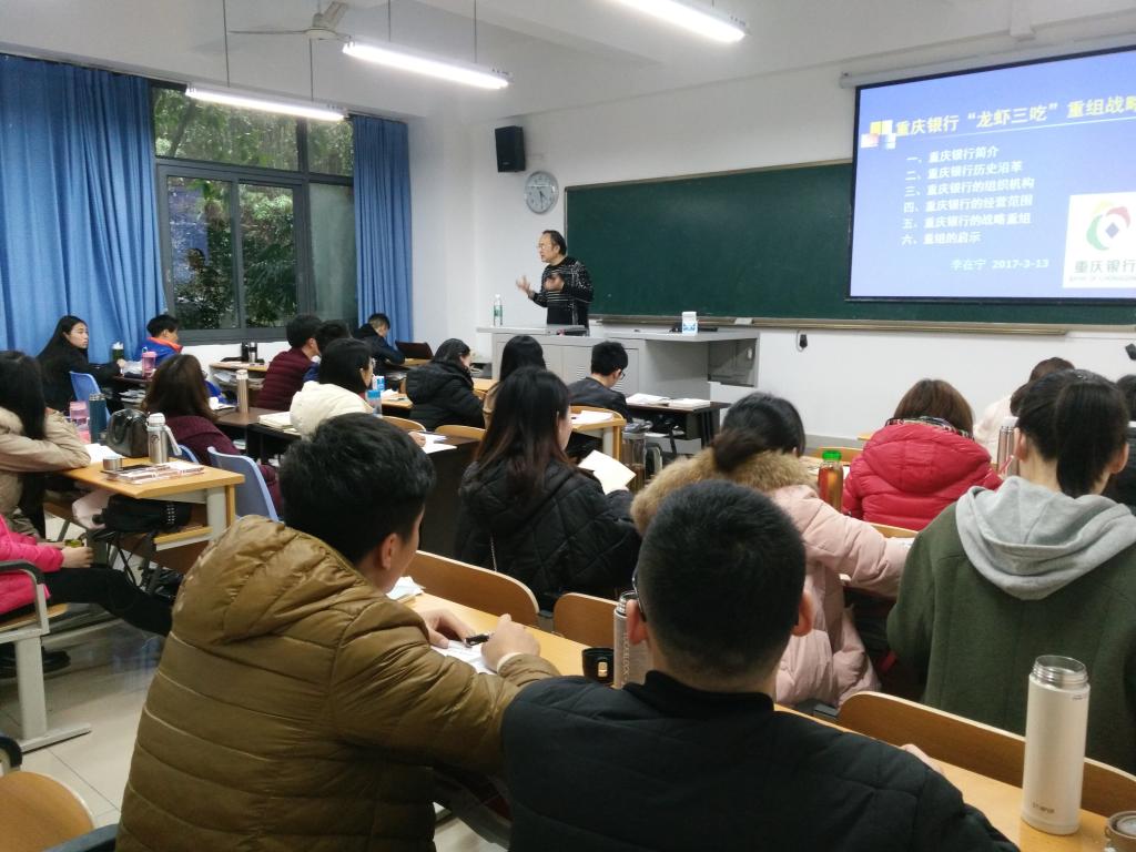 李在宁主任从资本运营管理视角,分析重庆银行重组战略。李主任首先讲到我国银行业发展改革的大背景:一是银行不良资产规模过大,资不抵债;二是资本金严重不足,运营风险增大;三是依靠存贷利差运营难度加大;四是银行管理制度不够健全。因此,我国银行业应从资本角度进行改革,当然,国有银行、民营银行以及混合型银行的改革路径有所不同。李主任以重庆银行战略重组为例,从重庆银行简介,到重组战略的选择、实施与保障,以及战略重组的成果,给同学们专业细致地讲解了资本管理的重要性。