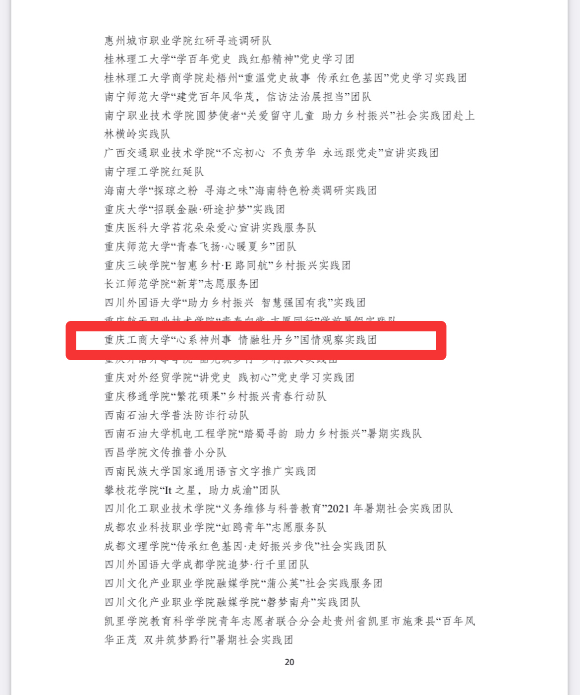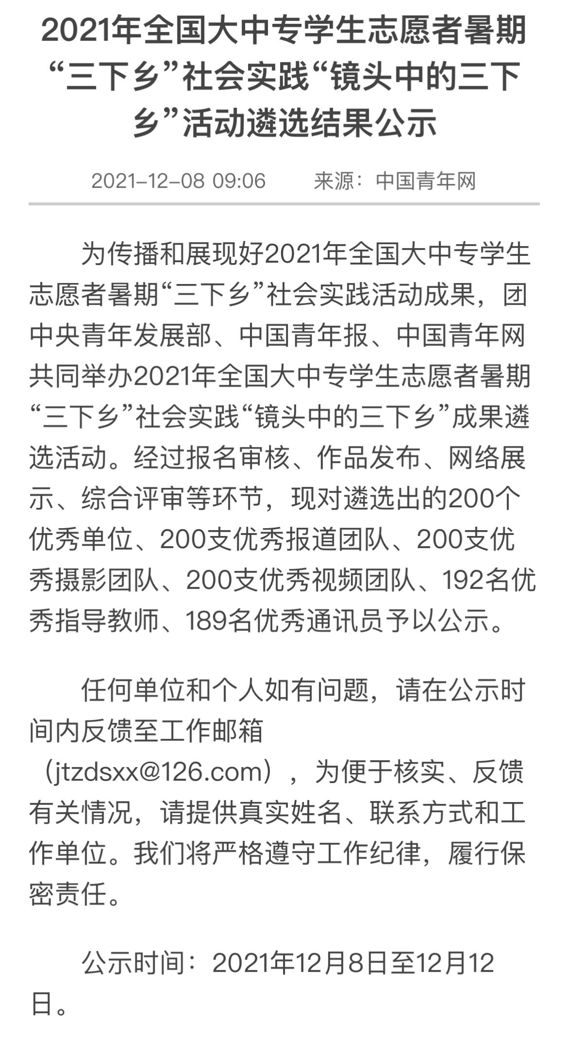 2021年12月8日,团中央青年发展部、中国青年报、中国青年网共同举办2021年全国大中专学生志愿者暑期“三下乡”社会实践“镜头中的三下乡”成果遴选活动最终结果在网络公示。天游8线路检测中心天游ty8线路1线路2检测中心暑期“三下乡”社会实践团队“心系神州事 情融牡丹乡”国情观察实践团荣获“优秀视频团队”称号。