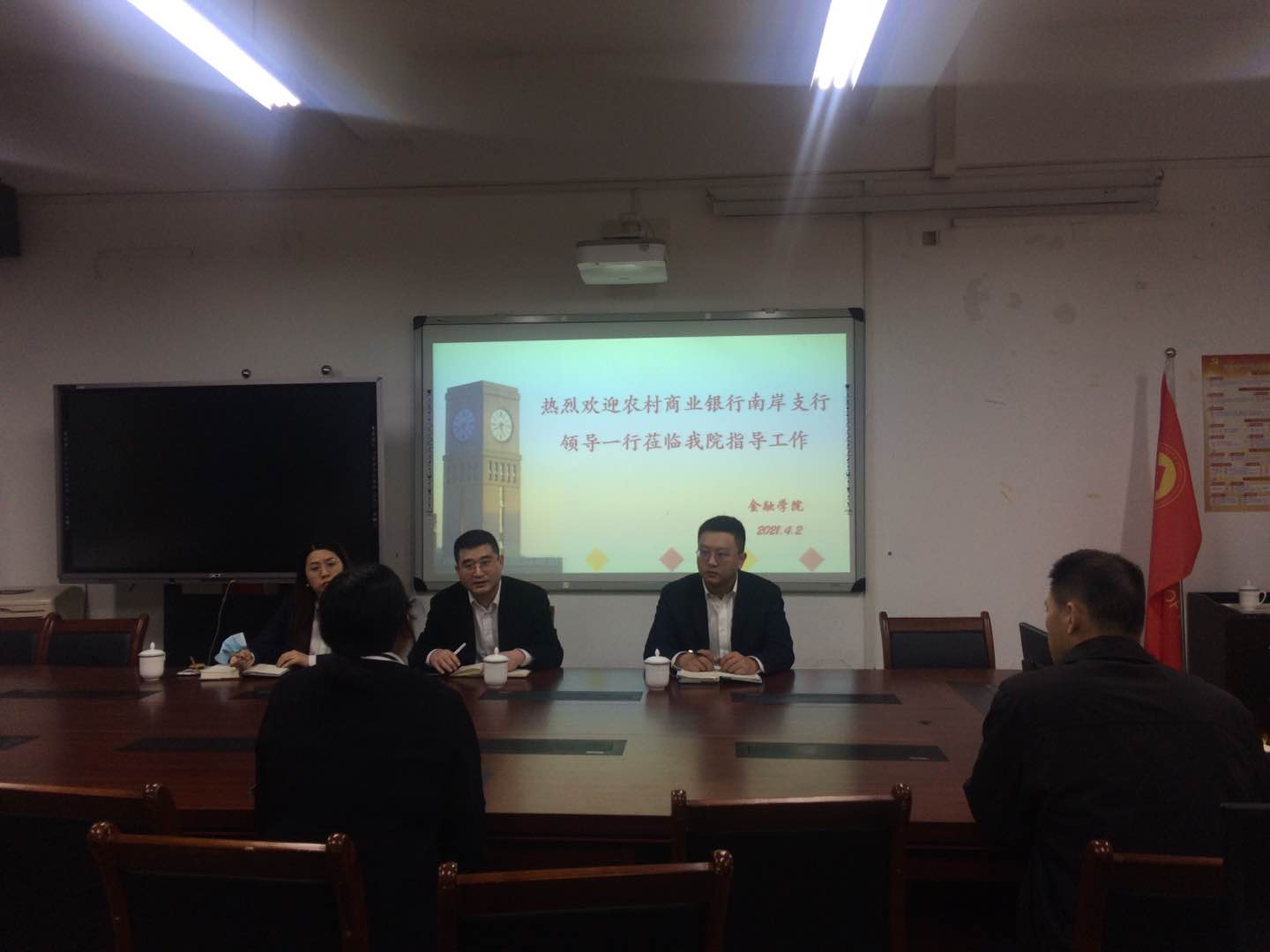 2021年4月2日,重庆农村商业银行南岸支行副行长王征一行到访天游ty8线路官网,洽谈合作事宜。天游ty8线路官网院长王兰教授、专职组织员赵甫刚同志出席会议。会议由王兰教授主持。