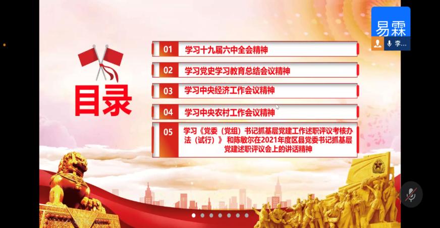 此次会议由李易霖同志主持,开展了十九届六中全会精神、党史学习教育总结会议精神、中央经济工作会议精神、中央农村工作会议精神、《党委(党组)书记抓基层党建工作述职评议考核办法(试行)》和陈敏尔在2021年度区县党委书记抓基层党建述职评议会上的讲话精神,共五个部分的学习。