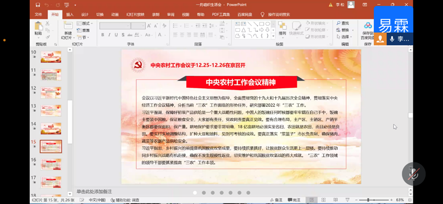 李易霖同志向所有党员同志详细介绍了十九届六中全会通过的《关于党的百年奋斗重大成就和历史经验的决议》、“四个伟大飞跃”、“两个确立”等。关于学习党史学习教育总结会议精神,习近平强调要总结党史学习教育成功经验,建立常态化、长效化制度机制,王沪宁表示要引导广大党员、干部深刻领悟中国共产党为什么能、马克思主义为什么行、中国特色社会主义为什么好。中央经济工作会议总结了2021年,部署了2022年经济工作,强调了新的一年经济工作稳字当头、稳中求进,做到5个正确认识和把握。中央农村工作会议制定了“三农”工作的目标,会议上习近平强调了保障好初级产品供给是一个重大战略性问题。最后,李易霖同志介绍了《党委(党组)书记抓基层党建工作述职评议考核办法(试行)》的八条规则以及市委书记陈敏尔抓紧抓实基层党建重点工作的严格要求。